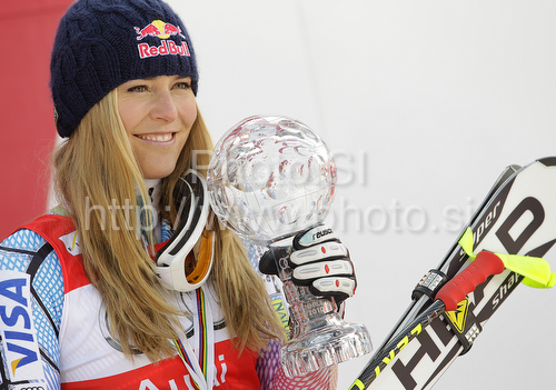 : Winner Lindsey Vonn of USA celebrates overall Downhill World cup victory after last Women downhill race of Audi FIS alpine skiing World Cup, which was held on Kandahar downhill course in Garmisch-Partenkirchen, Germany. Last downhill race of Women Audi FIS Alpine skiing World Cup 2009-10, was held on Wednesday, 10th of March 2010 in Garmisch-Partenkirchen, Germany.