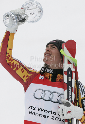 : Erik Guay of Canada celebrates overall Super-G World cup victory after last Men Super-G race of Audi FIS alpine skiing World Cup, which was held on Kandahar course in Garmisch-Partenkirchen, Germany. Last Super-G race of Men Audi FIS Alpine skiing World Cup 2009-10, was held on Thursday, 11th of March 2010 in Garmisch-Partenkirchen, Germany.