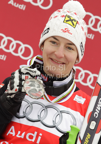 : Second placed Kathrin Zettel of Austria celebrates overall Super-G World cup medal after last Women Super-G race of Audi FIS alpine skiing World Cup, which was held on Kandahar course in Garmisch-Partenkirchen, Germany. Last Super-G race of Women Audi FIS Alpine skiing World Cup 2009-10, was held on Thursday, 11th of March 2010 in Garmisch-Partenkirchen, Germany.