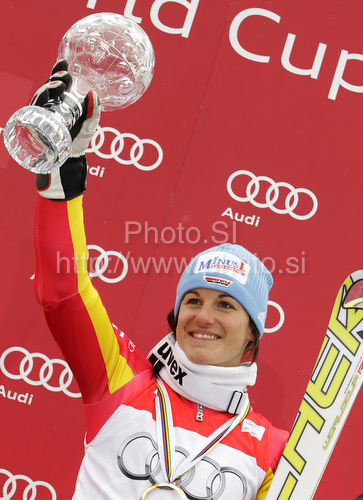 : Winner Kathrin Hoelzl of Germany celebrates overall Super-G World cup victory after last Women Super-G race of Audi FIS alpine skiing World Cup, which was held on Kandahar course in Garmisch-Partenkirchen, Germany. Last Super-G race of Women Audi FIS Alpine skiing World Cup 2009-10, was held on Thursday, 11th of March 2010 in Garmisch-Partenkirchen, Germany.
