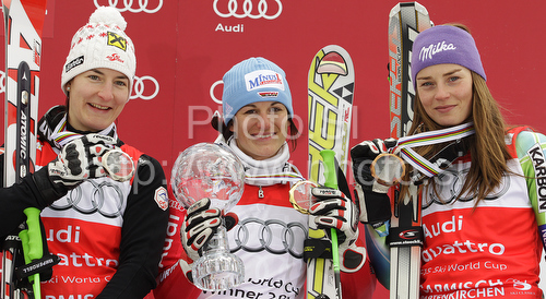 : Winner Kathrin Hoelzl of Germany (M), second placed Kathrin Zettel of Austria (L) and third placed Tina Maze of Slovenia (R) celebrates overall Super-G World cup victory after last Women Super-G race of Audi FIS alpine skiing World Cup, which was held on Kandahar course in Garmisch-Partenkirchen, Germany. Last Super-G race of Women Audi FIS Alpine skiing World Cup 2009-10, was held on Thursday, 11th of March 2010 in Garmisch-Partenkirchen, Germany.