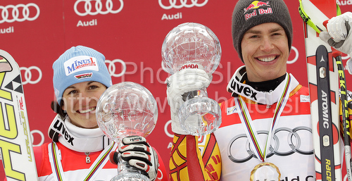 Garmisch-Partenkirchen ,Germany - 11.03.2010 : Overall super-g winner Erik Guay of Canada (R) and overall giant slalom winner Kathrin Hoelzl of Germany celebrates overall World cup victories after last Women Giant slalom and last men Super-G race of Audi FIS alpine skiing World Cup, which was held on Kandahar course in Garmisch-Partenkirchen, Germany. Last races of Women Audi FIS Alpine skiing World Cup 2009-10, were held on Thursday, 11th of March 2010 in Garmisch-Partenkirchen, Germany. Photo by: Leena Jeroncic