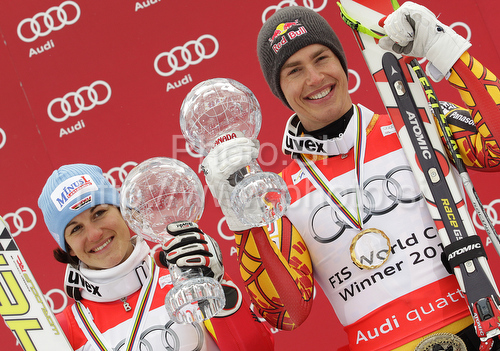 Garmisch-Partenkirchen ,Germany - 11.03.2010 : Overall super-g winner Erik Guay of Canada (R) and overall giant slalom winner Kathrin Hoelzl of Germany celebrates overall World cup victories after last Women Giant slalom and last men Super-G race of Audi FIS alpine skiing World Cup, which was held on Kandahar course in Garmisch-Partenkirchen, Germany. Last races of Women Audi FIS Alpine skiing World Cup 2009-10, were held on Thursday, 11th of March 2010 in Garmisch-Partenkirchen, Germany. Photo by: Leena Jeroncic