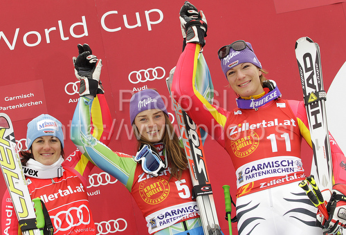 : Winner Tina Maze of Slovenia (M), second placed Kathrin Hoelzl of Germany (L) and third placed Maria Riesch of Germany (R) celebrate their medals won in last Women Giant slalom race of Audi FIS alpine skiing World Cup, which was held on Kandahar course in Garmisch-Partenkirchen, Germany. Last Giant slalom race of Women Audi FIS Alpine skiing World Cup 2009-10, was held on Thursday, 11th of March 2010 in Garmisch-Partenkirchen, Germany.