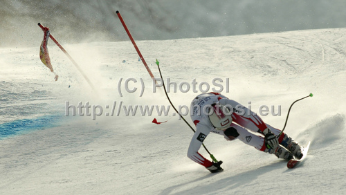 : Andrea Fischbacher of Austria crashing in last Women super-g race of Audi FIS alpine skiing World Cup, which was held on Kandahar course in Garmisch-Partenkirchen, Germany. Last Super-g race of Women Audi FIS Alpine skiing World Cup 2009-10, was held on Friday, 12th of March 2010 in Garmisch-Partenkirchen, Germany.