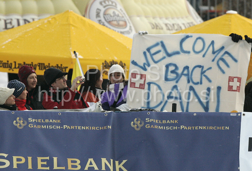 : Welcome back sign for Daniel Albrecht of Switzerland in finish of first run of last Men Giant slalom race of Audi FIS alpine skiing World Cup, which was held on Kandahar course in Garmisch-Partenkirchen, Germany. Last Giant slalom race of Men Audi FIS Alpine skiing World Cup 2009-10, was held on Friday, 12th of March 2010 in Garmisch-Partenkirchen, Germany.