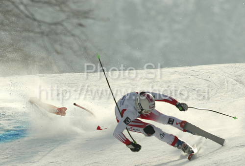 : Andrea Fischbacher of Austria crashing in last Women super-g race of Audi FIS alpine skiing World Cup, which was held on Kandahar course in Garmisch-Partenkirchen, Germany. Last Super-g race of Women Audi FIS Alpine skiing World Cup 2009-10, was held on Friday, 12th of March 2010 in Garmisch-Partenkirchen, Germany.