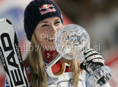 Garmisch-Partenkirchen ,Germany - 12.03.2010 : Lindsey Vonn of USA celebrating her overall Super-G World cup victory after last Women super-g race of Audi FIS alpine skiing World Cup, which was held on Kandahar course in Garmisch-Partenkirchen, Germany. Last Super-g race of Women Audi FIS Alpine skiing World Cup 2009-10, was held on Friday, 12th of March 2010 in Garmisch-Partenkirchen, Germany. Photo by: Leena Jeroncic