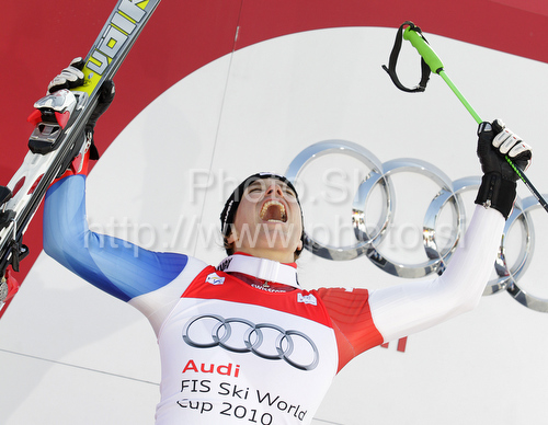 : Third placed Nadia Styger of Switzerland celebrates overall Super-G World cup medal after last Women Super-G race of Audi FIS alpine skiing World Cup, which was held on Kandahar course in Garmisch-Partenkirchen, Germany. Last super-g race of Women Audi FIS Alpine skiing World Cup 2009-10, was held on Friday, 12th of March 2010 in Garmisch-Partenkirchen, Germany.