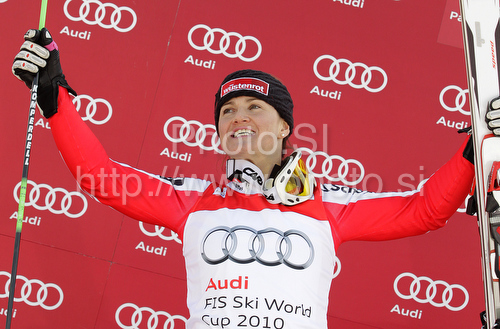 : Second placed Elisabeth Goergl of Austria celebrates overall Super-G World cup medal after last Women Super-G race of Audi FIS alpine skiing World Cup, which was held on Kandahar course in Garmisch-Partenkirchen, Germany. Last super-g race of Women Audi FIS Alpine skiing World Cup 2009-10, was held on Friday, 12th of March 2010 in Garmisch-Partenkirchen, Germany.