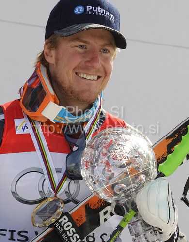 : Winner Ted Ligety of USA celebrates overall Giant slalom World cup victory after last Men giant slalom race of Audi FIS alpine skiing World Cup, which was held on Kandahar course in Garmisch-Partenkirchen, Germany. Last giant slalom race of Men Audi FIS Alpine skiing World Cup 2009-10, was held on Friday, 12th of March 2010 in Garmisch-Partenkirchen, Germany.
