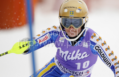 : Maria Pietilae-Holmner of Sweden skiing in first run of last Women slalom race of Audi FIS alpine skiing World Cup, which was held on Gudiberg course in Garmisch-Partenkirchen, Germany. Last slalom race of Women Audi FIS Alpine skiing World Cup 2009-10, was held on Saturday, 13th of March 2010 in Garmisch-Partenkirchen, Germany.