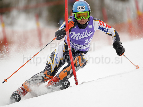 : Tanja Poutiainen of Finland skiing in first run of last Women slalom race of Audi FIS alpine skiing World Cup, which was held on Gudiberg course in Garmisch-Partenkirchen, Germany. Last slalom race of Women Audi FIS Alpine skiing World Cup 2009-10, was held on Saturday, 13th of March 2010 in Garmisch-Partenkirchen, Germany.