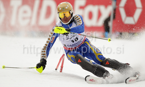: Andre Myhrer of Sweden skiing in first run of last Men slalom race of Audi FIS alpine skiing World Cup, which was held on Gudiberg course in Garmisch-Partenkirchen, Germany. Last slalom race of Men Audi FIS Alpine skiing World Cup 2009-10, was held on Saturday, 13th of March 2010 in Garmisch-Partenkirchen, Germany.