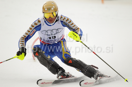: Andre Myhrer of Sweden skiing in first run of last Men slalom race of Audi FIS alpine skiing World Cup, which was held on Gudiberg course in Garmisch-Partenkirchen, Germany. Last slalom race of Men Audi FIS Alpine skiing World Cup 2009-10, was held on Saturday, 13th of March 2010 in Garmisch-Partenkirchen, Germany.