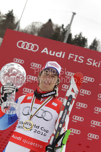 : Carlo Janka of Switzerland celebrates overall Audi FIS Alpine skiing World cup victory after last race of Audi FIS alpine skiing World Cup, which was held in Garmisch-Partenkirchen, Germany. Last slalom race of Audi FIS Alpine skiing World Cup 2009-10, was held on Saturday, 13th of March 2010 in Garmisch-Partenkirchen, Germany.