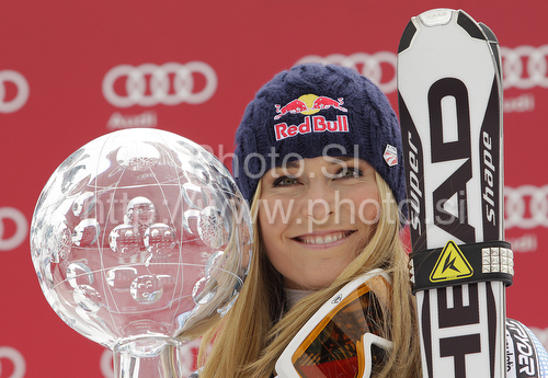 : Winner Lindsey Vonn of USA celebrates overall Audi FIS Alpine skiing World cup victory after last race of Audi FIS alpine skiing World Cup, which was held in Garmisch-Partenkirchen, Germany. Last slalom race of Audi FIS Alpine skiing World Cup 2009-10, was held on Saturday, 13th of March 2010 in Garmisch-Partenkirchen, Germany.