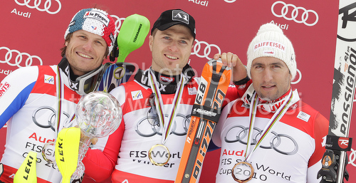 : Winner Reinfried Herbst of Austria (M), second placed Julien Lizeroux of France (L) and third placed Silvan Zurbriggen of Switzerland (R) celebrate overall slalom World cup medals after last Men slalom race of Audi FIS alpine skiing World Cup, which was held on Gudiberg course in Garmisch-Partenkirchen, Germany. Last slalom race of Men Audi FIS Alpine skiing World Cup 2009-10, was held on Saturday, 13th of March 2010 in Garmisch-Partenkirchen, Germany.