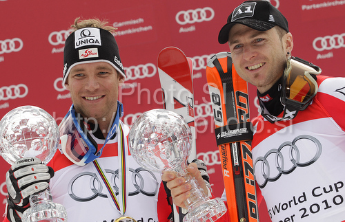 Garmisch-Partenkirchen ,Germany - 13.03.2010 : Winner of overall slalom World cup Reinfried Herbst of Austria (R) and winner of super combined World cup Benjamin Raich of Austria (L) celebrates their victories victory after last Men slalom race of Audi FIS alpine skiing World Cup, which was held on Gudiberg course in Garmisch-Partenkirchen, Germany. Last slalom race of Men Audi FIS Alpine skiing World Cup 2009-10, was held on Saturday, 13th of March 2010 in Garmisch-Partenkirchen, Germany. Photo by: Primoz Jeroncic