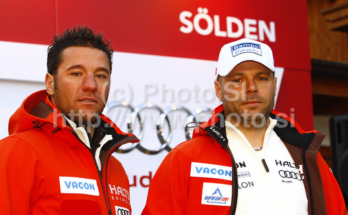 : Coaches of Finnish women alpine ski team, Christian Thoma (R) and Luca Moretti (L) during Audi Media talk event in Soelden, Austria. Audi Media talk event was held on Thursday, 21st of October 2010 in Soelden, Austria, before start of Audi FIS Alpine skiing World cup 2010-2011, which will start with women giant slalom race on Saturday, 23rd of October 2010, and will be followed by men giant slalom race day later on Rettenbach glacier above Soelden, Austria.