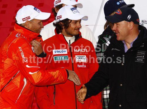Soelden ,Austria - 21.10.2010 : Kalle Palander of Finland (L) talking with Didier Cuche of Switzerland (R) during Audi Media talk event in Soelden, Austria. Audi Media talk event was held on Thursday, 21st of October 2010 in Soelden, Austria, before start of Audi FIS Alpine skiing World cup 2010-2011, which will start with women giant slalom race on Saturday, 23rd of October 2010, and will be followed by men giant slalom race day later on Rettenbach glacier above Soelden, Austria. Photo by: Primoz Jeroncic