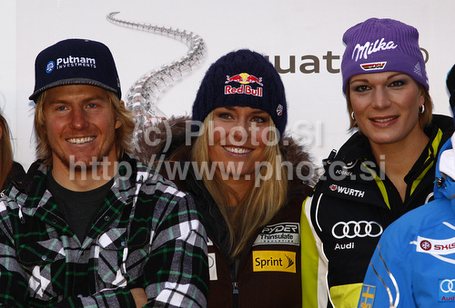 : Ted Ligety of USA (L), Lindsey Vonn of USA (M) and Maria Riesch of Germany (R) during Audi Media talk event in Soelden, Austria. Audi Media talk event was held on Thursday, 21st of October 2010 in Soelden, Austria, before start of Audi FIS Alpine skiing World cup 2010-2011, which will start with women giant slalom race on Saturday, 23rd of October 2010, and will be followed by men giant slalom race day later on Rettenbach glacier above Soelden, Austria.