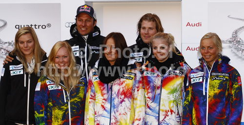 : Norwegian team with Aksel Lund Svindal during Audi Media talk event in Soelden, Austria. Audi Media talk event was held on Thursday, 21st of October 2010 in Soelden, Austria, before start of Audi FIS Alpine skiing World cup 2010-2011, which will start with women giant slalom race on Saturday, 23rd of October 2010, and will be followed by men giant slalom race day later on Rettenbach glacier above Soelden, Austria.