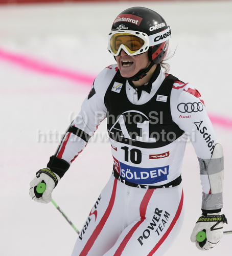 : Elisabeth Goergl of Austria reacts in finish of second run of Women giant slalom race of Audi FIS alpine skiing World Cup in Soelden, Austria. First giant slalom race of Women Audi FIS Alpine skiing World Cup 2010-11, was held on Saturday, 23rd of October 2010, on Rettenbach glacier above Soelden, Austria.
