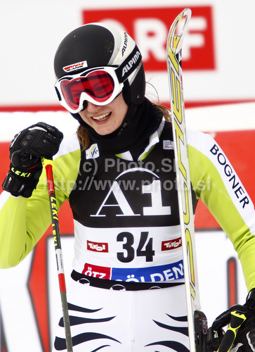 : Lena Duerr of Germany reacts in finish of second run of Women giant slalom race of Audi FIS alpine skiing World Cup in Soelden, Austria. First giant slalom race of Women Audi FIS Alpine skiing World Cup 2010-11, was held on Saturday, 23rd of October 2010, on Rettenbach glacier above Soelden, Austria.