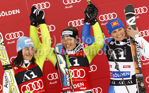 : Winner Viktoria Rebensburg of Germany (M), second placed Kathrin Hoelzl of Germany (L) and third placed Manuela Moelgg of Italy (R) celebrate their medals won in Women giant slalom race of Audi FIS alpine skiing World Cup in Soelden, Austria. First giant slalom race of Women Audi FIS Alpine skiing World Cup 2010-11, was held on Saturday, 23rd of October 2010, on Rettenbach glacier above Soelden, Austria.