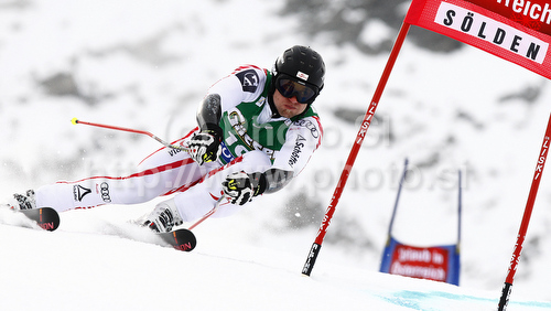 : Romed Baumann of Austria skiing in first run of Men giant slalom race of Audi FIS alpine skiing World Cup in Soelden, Austria. First giant slalom race of Men Audi FIS Alpine skiing World Cup 2010-11, was held on Sunday, 24th of October 2010, on Rettenbach glacier above Soelden, Austria.