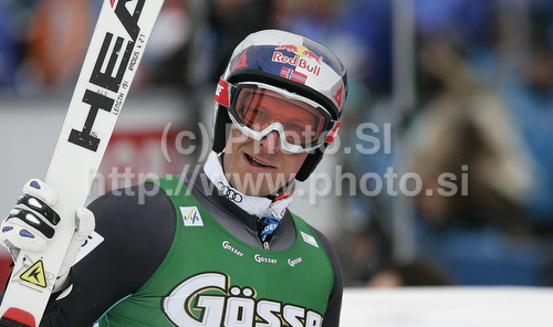 : Aksel Lund Svindal of Norway reacts in finish of first run of Men giant slalom race of Audi FIS alpine skiing World Cup in Soelden, Austria. First giant slalom race of Men Audi FIS Alpine skiing World Cup 2010-11, was held on Sunday, 24th of October 2010, on Rettenbach glacier above Soelden, Austria.