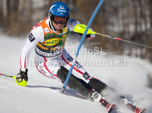 : RAICH Benjamin AUT attacks a control gate whilst competing in the FIS alpine skiing world cup slalom race on the Bellevarde race piste Val dIsere.