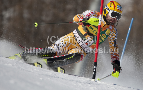Val dIsere ,France - 12.12.2010 : COUSINEAU Julien CAN attacks a control gate whilst competing in the FIS alpine skiing world cup slalom race on the Bellevarde race piste Val dIsere. Photo by: Mitchell Gunn / PhotoSI