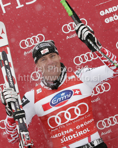 Val Gardena ,Italy - 17.12.2010 : Winner Michael Walchhofer of Austria celebrates his medal won in Men Super-G race of Audi FIS alpine skiing World Cup in Val Gardena, Italy. Super-G race of Men Audi FIS Alpine skiing World Cup 2010-11, was held on Friday, 17th of December 2010, on Saslong course in Val Gardena, Italy. Photo by: Mitja Smid Bricelj