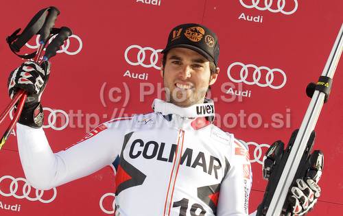 : Third placed Thomas Fanara of France celebrates his medal won in Men giant slalom race of Audi FIS alpine skiing World Cup in Alta Badia, Italy. Giant slalom race of Men Audi FIS Alpine skiing World Cup 2010-11, was held on Sunday, 20th of December 2010, on Gran Risa course in Alta Badia, Italy.