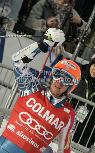 : Winner Ted Ligety of USA reacts in finish of second run of Men giant slalom race of Audi FIS alpine skiing World Cup in Alta Badia, Italy. Giant slalom race of Men Audi FIS Alpine skiing World Cup 2010-11, was held on Sunday, 20th of December 2010, on Gran Risa course in Alta Badia, Italy.
