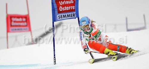 : Tanja Poutiainen of Finland skiing in first run of Women giant slalom race of Audi FIS alpine skiing World Cup in Semmering, Austria. Giant slalom race of Women Audi FIS Alpine skiing World Cup 2010-11, was held on Tuesday, 28th of December 2010, in Semmering, Austria.