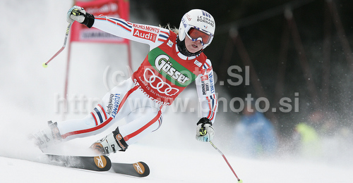 : Tessa Worley of France skiing in first run of Women giant slalom race of Audi FIS alpine skiing World Cup in Semmering, Austria. Giant slalom race of Women Audi FIS Alpine skiing World Cup 2010-11, was held on Tuesday, 28th of December 2010, in Semmering, Austria.
