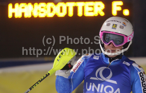 : Frida Hansdotter of Sweden reacts in finish of second run of Women slalom race of Audi FIS alpine skiing World Cup in Semmering, Austria. Slalom race of Women Audi FIS Alpine skiing World Cup 2010-11, was held on Wednesday, 29th of December 2010, in Semmering, Austria.