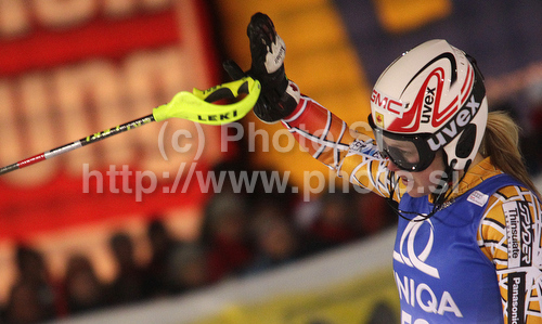 : Erin Mielzynski of Canada reacts in finish of second run of Women slalom race of Audi FIS alpine skiing World Cup in Semmering, Austria. Slalom race of Women Audi FIS Alpine skiing World Cup 2010-11, was held on Wednesday, 29th of December 2010, in Semmering, Austria.