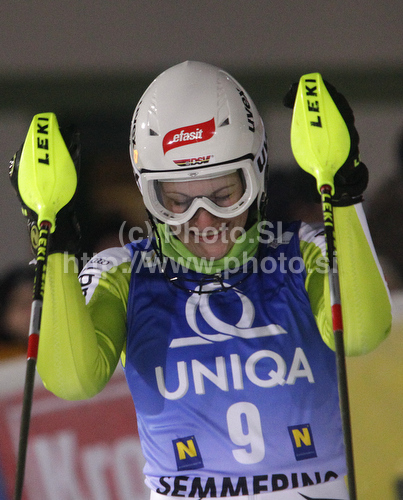 : Third placed Christina Geiger of Germany reacts in finish of second run of Women slalom race of Audi FIS alpine skiing World Cup in Semmering, Austria. Slalom race of Women Audi FIS Alpine skiing World Cup 2010-11, was held on Wednesday, 29th of December 2010, in Semmering, Austria.