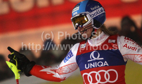 : Tanja Poutiainen of Finland reacts in finish of second run of Women slalom race of Audi FIS alpine skiing World Cup in Semmering, Austria. Slalom race of Women Audi FIS Alpine skiing World Cup 2010-11, was held on Wednesday, 29th of December 2010, in Semmering, Austria.