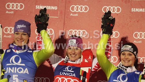 : Winner Marlies Schild of Austria (M), second placed Maria Riesch of Germany (L) and third placed Christina Geiger of Germany (R) celebrate their medals won in Women slalom race of Audi FIS alpine skiing World Cup in Semmering, Austria. Slalom race of Women Audi FIS Alpine skiing World Cup 2010-11, was held on Wednesday, 29th of December 2010, in Semmering, Austria.