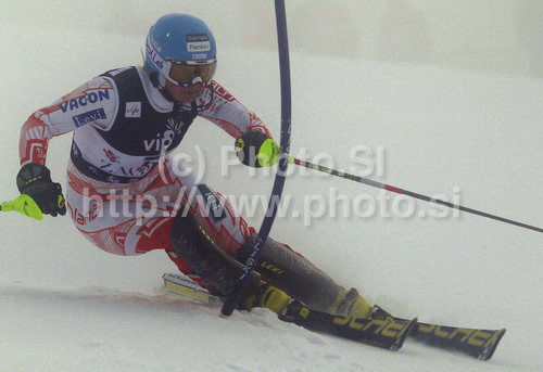 : Tanja Poutiainen of Finland skiing in first run of Women slalom race of Audi FIS alpine skiing World Cup in Zagreb, Croatia. Slalom race of Women Audi FIS Alpine skiing World Cup 2010-11, was held on Tuesday, 4th of January 2011, in Sljeme above Zagreb, Croatia.