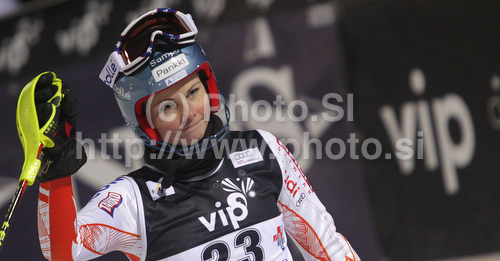 : Sanni Leinonen of Finland reacts in finish of second run of Women slalom race of Audi FIS alpine skiing World Cup in Zagreb, Croatia. Slalom race of Women Audi FIS Alpine skiing World Cup 2010-11, was held on Tuesday, 4th of January 2011, in Sljeme above Zagreb, Croatia.
