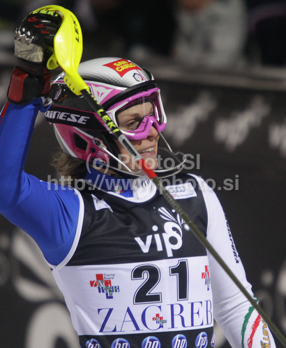 : Second placed Manuela Moelgg of Italy reacts in finish of second run of Women slalom race of Audi FIS alpine skiing World Cup in Zagreb, Croatia. Slalom race of Women Audi FIS Alpine skiing World Cup 2010-11, was held on Tuesday, 4th of January 2011, in Sljeme above Zagreb, Croatia.