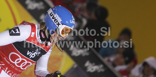 : Winner Marlies Schild of Austria reacts in finish of second run of Women slalom race of Audi FIS alpine skiing World Cup in Zagreb, Croatia. Slalom race of Women Audi FIS Alpine skiing World Cup 2010-11, was held on Tuesday, 4th of January 2011, in Sljeme above Zagreb, Croatia.