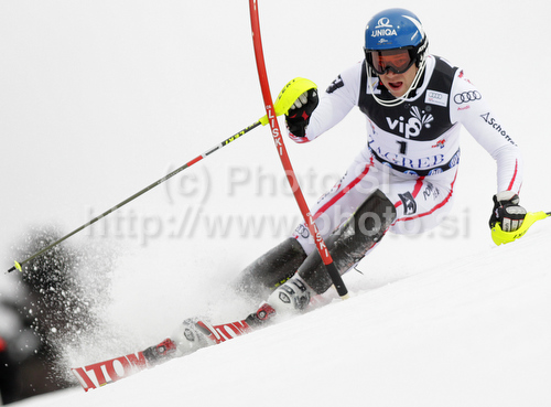 Zagreb ,Croatia - 06.01.2011 : Benjamin Raich of Austria skiing in first run of Men slalom race of Audi FIS alpine skiing World Cup in Zagreb, Croatia. Slalom race of Men Audi FIS Alpine skiing World Cup 2010-11, was held on Thursday, 6th of January 2011, in Sljeme above Zagreb, Croatia. Photo by: Primoz Jeroncic