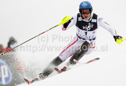: Benjamin Raich of Austria skiing in first run of Men slalom race of Audi FIS alpine skiing World Cup in Zagreb, Croatia. Slalom race of Men Audi FIS Alpine skiing World Cup 2010-11, was held on Thursday, 6th of January 2011, in Sljeme above Zagreb, Croatia.